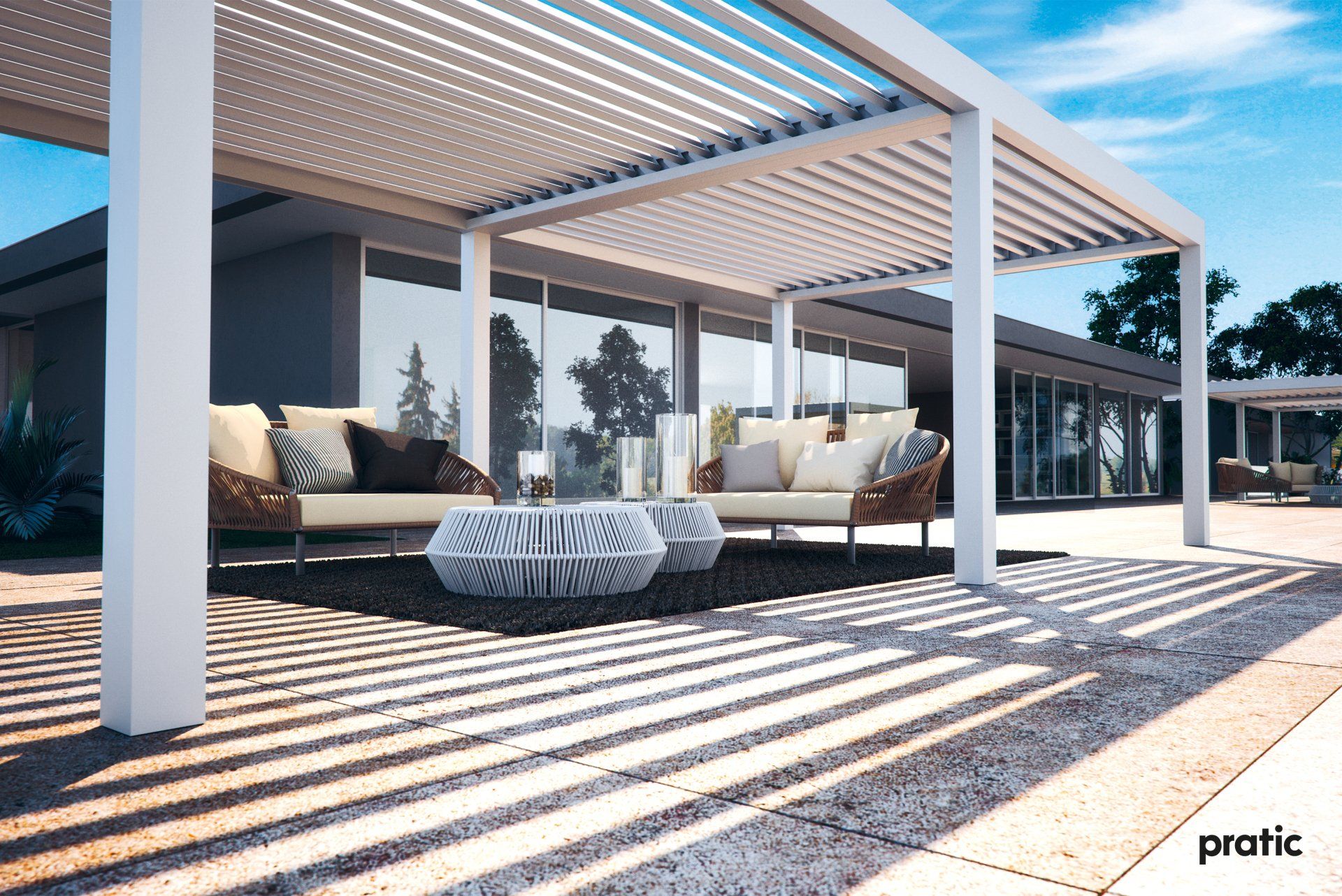Aluminum bioclimatic pergola with sun protection slats adjustable up to 140 °.