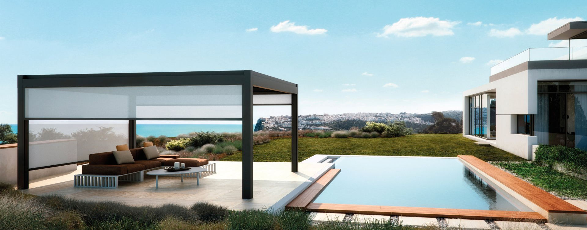 Для создания защищенной и частной территории на открытом воздухе идеальным решением являются вертикальные навесы и беседки. Доступные с фильтром или затемняющей тканью и в различных цветах, они создают пространство, полное комфорта. Граничные жалюзи идеально вписываются в горизонтальный профиль беседки и полностью исчезают после закрытия.